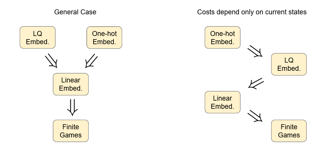 We are interested in the one-hot embeddability of games because one-hot embeddable games are always LQ embeddable given that the rewards only depend on game states and not the game actions. In this case the quadratic reward embedding criterion reduces to finding a matrix \(Q_t\) such that \(c_i(t, x, u_1, \dots, u_N) = f(x)^\top Q_t^i f(x).\)