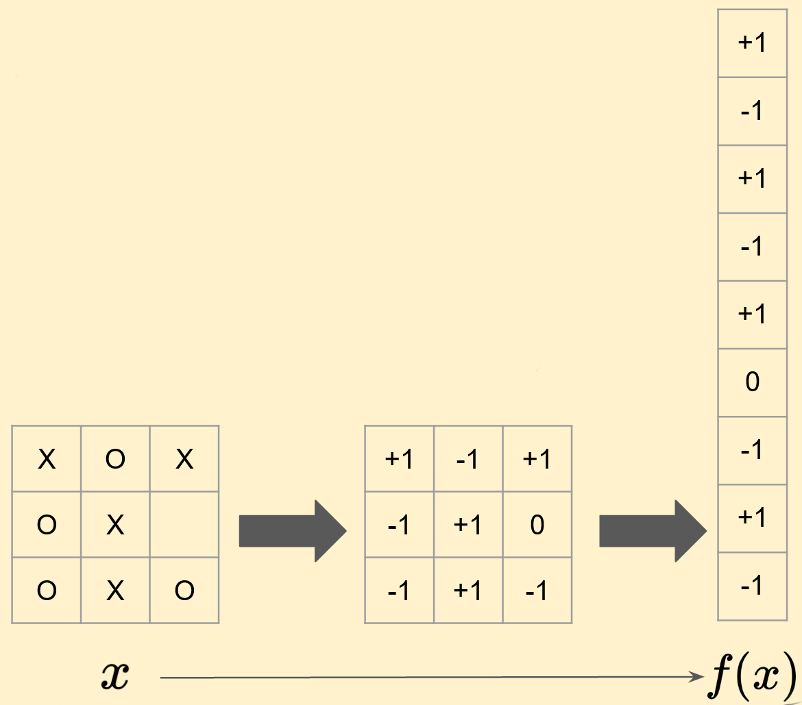 After this enumeration, to embed the game state into a state in 9-dimensional Euclidean space, we can simply flatten the tic-tac-toe table into a 9 long vector. The following image shows an example of this process.